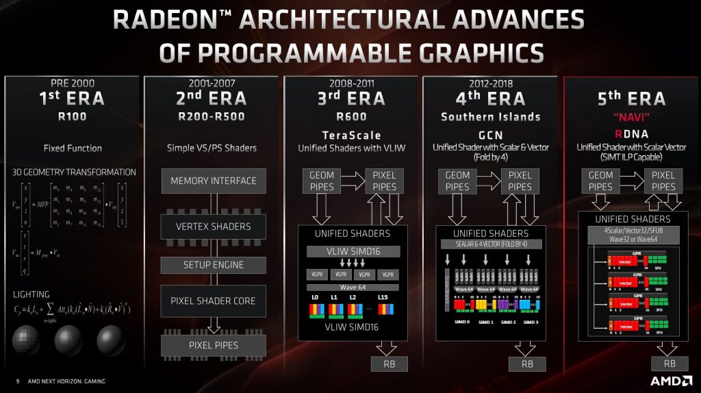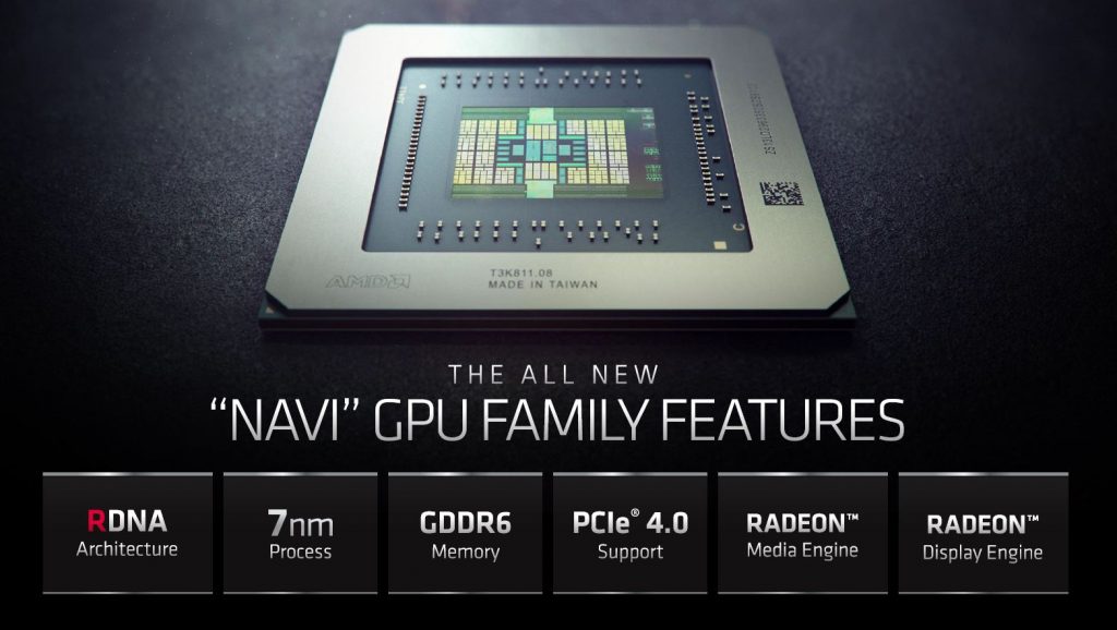 เขากลับมาพร้อมกับสถาปัตยกรรมใหม่ที่เรียกว่า RDNA และถือว่าผ่านมาถึง 5 เจนแล้วสำหรับเจ้า RADEON ซึ่งก็ได้ทำการปรับปรุงโคตรสร้างด้านใน GPU ใหม่ทั้งหมดต่างไปจาก GCN รุ่นเก่าแบบยกเครื่องใหม่เลยก็ว่าได้ครับ โดยหลักๆ เลยก็คือ GPU Navi 10 รุ่นนี้จะผลิตที่กระบวนการที่เล็กลง เหลือเพียง 7nm. เท่านั้นเอง และก็เริ่มขยับมาใช้แรม GDDR6 ขนาดความจุ 8GB และเชื่อมต่อผ่าน Interface PCIe4.0 เป็นตัวแรกของโลกอีกด้วย จัดว่าเทคโนโลยีล้ำอนาคตไปกันเลยทีเดียว หุหุ…