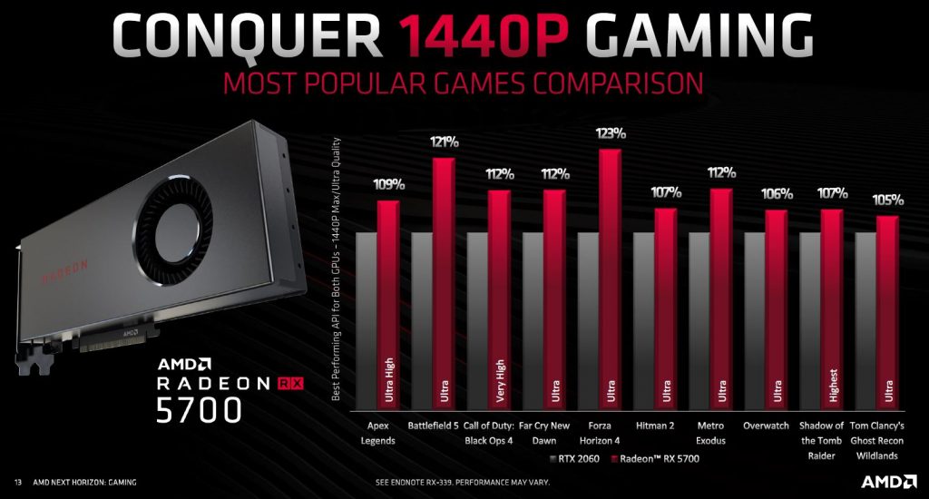 สำหรับเจ้า RX 5700 นั้นถูกส่งออกมาลุยตลาดเกมระดับกลาง-บน ที่ขนาดความละเอียด 1440p นั้นทาง AMD ได้ส่งเจ้า RX 5700 ลงไปสู้กับ RTX 2060 ซึ่งพบว่าให้ประสิทธิภาพในการเล่นเกมที่ดีกว่าแบบชัดเจนครับ