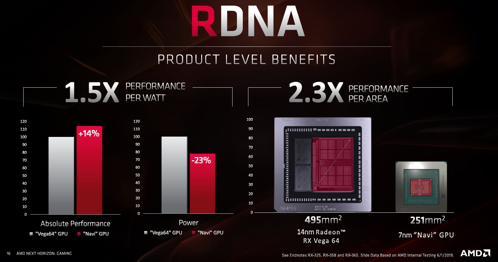 เทียบรุ่นกันกับ Vega64 GPU รุ่นเดิม เราจะเห็นได้ว่าเจ้า Navi GPU นั้นจะให้ประสิทธิภาพ Performance/Watt หรืออัตราการใช้พลังงานต่อประสิทธิภาพที่ดีกว่าเดิมถึง 1.5x เท่าตัวกันเลยทีเดียว โดยจะแรงขึ้นประมาณ +14% และกินไฟลดลง -23% เมื่อเทียบกับของเดิม และยังใช้พื้นที่ในการออกแบบตัว GPU ที่เล็กลงมากอีกด้วยครับ เพราะมันถูกผลิตด้วยกระบนการ 7nm. เท่านั้นเอง