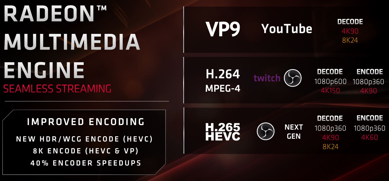 รายละเอียดของการ Streaming ที่รองรับ HDR/WCG (HEVC) ยกระดับคุณภาพได้ถึง 8K (HEVC/VP) โดยทาง AMD กล่าวว่าได้เพิ่มประสิทธิภาพในการ Encoder ที่เร็วขึ้นกว่าเดิมถึง 40% กันเลยทีเดียว