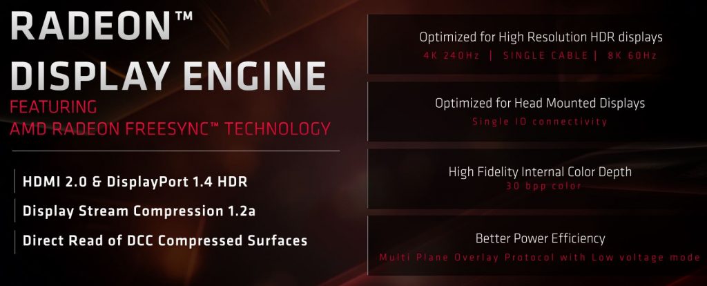 ส่วนทางด้าน Display Engine นั้นก็ยังคงรองรับเทคโนโลยีที่ทันสมัยอย่าง Freesync 2 HDR, HDMI 2.0b & Display Port 1.4HDR, Dolby Vision HDR10, Display Stream Compression 1.2a หรือที่เรียกว่า DSC เทคโนโลยี จุดเด่นของมันเลยก็คือ ถ้าต่อใช้งานร่วมกับ Monitor ที่รองรับด้วยแล้ว จะสามารถต่อสาย DP1.4 แบบ DSC ได้เพียงสาย 1 เส้นพร้อมกับคุณภาพในระดับ 4K 144Hz กันเลยทีเดียว ซึ่งปกติแล้วจอทั่วไปจะต้องใช้ DP 1.4 ถึง 2 เส้นครับ โดยทาง AMD เคลมว่าคุณภาพที่บีบอัดในสาย DP1.4 เพียงเส้นเดียวด้วย DSC นั้นจะยังคงให้คุณภาพที่ดีเหมือนเดิมครับ และในสตอนนี้จอภาพ Monitor ที่รองรับตัวแรกของโลกน่าจะเป็น Gaming Monitor จากค่าย ROG ที่ออกมารองรับเทคโนโลยี DSC แล้วเป็นที่เรียกร้อย… โดยเขาบอกว่าเป็นตัวแรกของโลกด้วยครับ ^^”