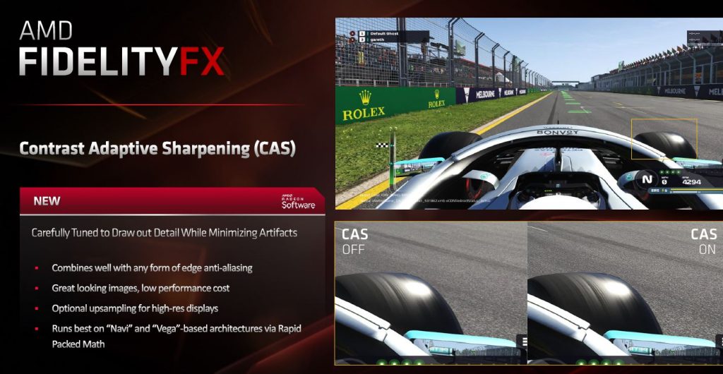 AMD FidelityFX เทคโนโลยีใหม่ ที่ช่วยให้ภาพในเกม 3D ที่สวยงามลบคมและเหลี่ยมออกไปได้แบบหมดจดที่เรียกว่า Contrast Adaptive Sharpening (CAS) และนอกจากนี้ยังช่วยให้นักพัฒนาเกมเอาไปพัฒนาเกมให้มีภาพดูมีรายละเอียดที่แน่นขึ้น โดยไม่กินทรัพยากรเครื่องมากนัก หรือจะกล่าวอีกอย่างหนึ่งเลยก็จะไม่หนักไปทาง Hardware แต่จะเอื้อไปทาง Engine ของนักพัฒนาเกมเสียมากกว่า โดยทาง AMD ได้ทำเป็นแบบ Open Source Impage Quality Toolkit ดังนั้นสาย dev. เกมน่าจะชิวมากขึ้นครับ ^^”