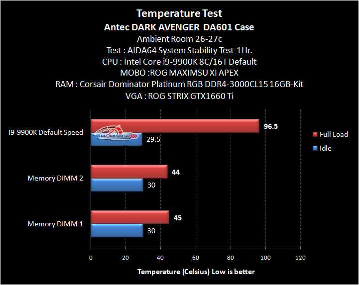 ส่วนแรม DDR4 ของ Corsair Dominator Platinum RGB DDR4-3000Mhz CL15-17-17-35 16GB-Kit ชุดนี้ช่วง Stress test ก็ร้อนสุดๆเพียง 44-45c องศาเซลเซียสเท่านั้นเอง ดังนั้นสรุปแบบคร่าวๆ ถ้าเพิ่มพัดลมระบายความร้อนเข้าไปอีก 3-4 ตัว ก็น่าจะช่วยให้ระบบ Air-Flow ภายใน Case ดันลมร้อนได้ดีมากขึ้น และน่าจะส่งผลให้ CPU ในช่วง Full Load เย็นลงอีก 2-3c ได้อยู่นะครับ…