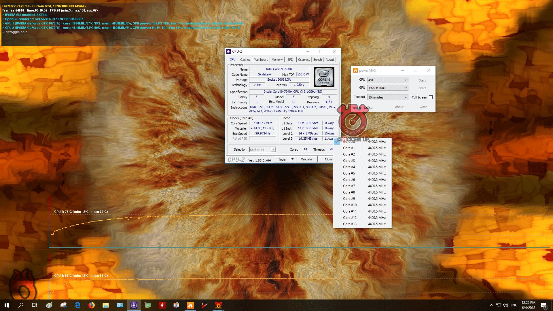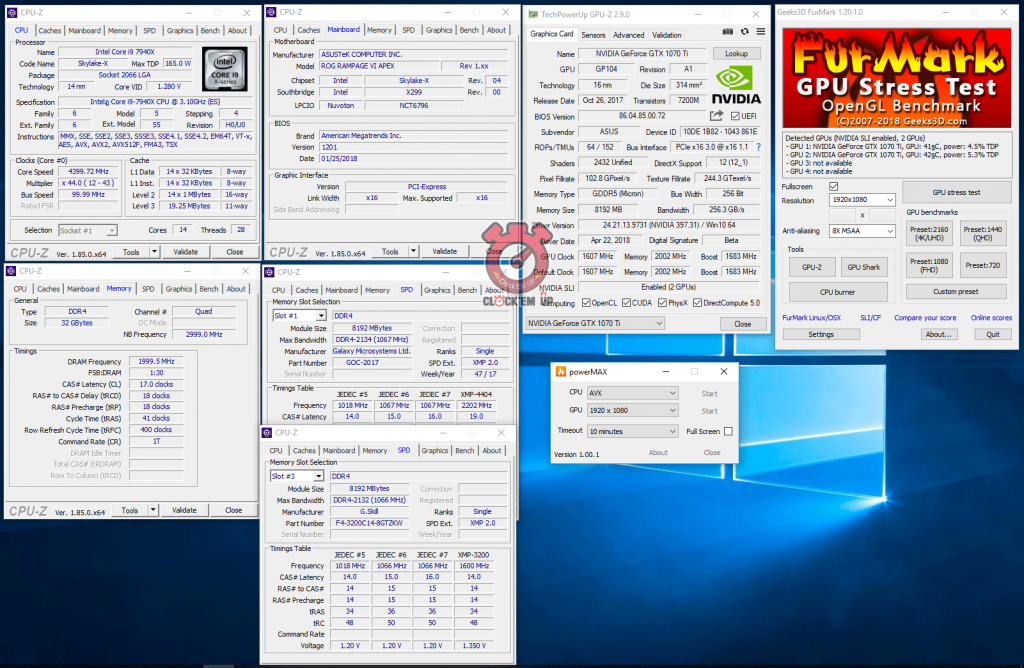 เราจะโปรแกรม Furmark GPU Burn-In เป็นตัว Load 100% สำหรับการ์ด GTX1070 Ti ทั้ง 2 ใบ และใช้โปรแกรม CPUID PowerMax ทำการเป็นตัวสั่งให้ CPU Full Load ด้วยชุดคำสั่ง AVX
