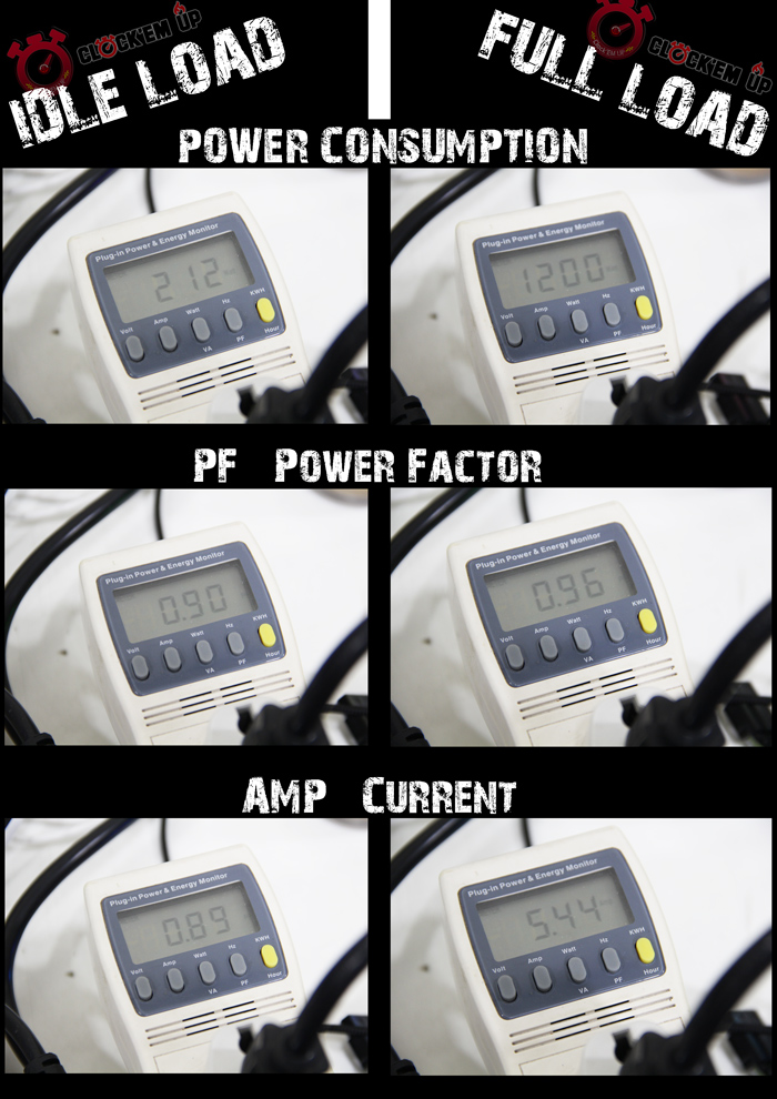 ในเรื่องของอัตราการใช้พลังงานต่างๆ นั้นชุด System ของเราสามารถสร้างโหลด ได้สูงสุดที่ระดับ 1200Watt Peak และช่วง Idle นั้นจะอยู่ที่ประมาณ 212Watt ค่า PF ของ PSU ลูกนี้วัดได้ที่ช่วง Idle/Full @ 0.90/0.96 และกินกระแสอยู่ที่ Idle/Full @ 0.89/5.44 Amp กันเลยทีเดียว ก็จัดว่าเป็น PSU ลูกหนึ่งที่จ่ายไฟได้เต็ม ไม่มีอาการวูบหรือดับให้เห็นเลยแม้แต่น้อย และก็ทำงานแบบ Active PFC เมื่อมี Load ประมาณ 1200Watt ก็ Active 0จากค่าย FP 0.90 เป็น 0.96 ก็จัดว่าไม่ธรรมดาแล้วล่ะครับ