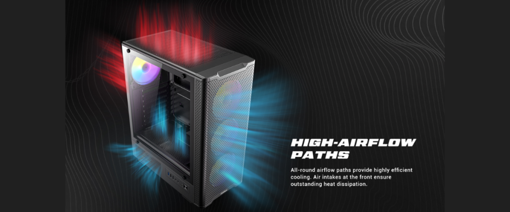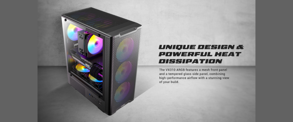 การออกแบบที่ไม่เหมือนใครและการระบายความร้อนที่ทรงพลัง VX310 ARGB โดดเด่นด้วยแผงหน้าตาข่าย (Mesh Front Panel) และแผงข้างกระจกนิรภัย (Tempered Glass Side Panel) ผสมผสานประสิทธิภาพการไหลเวียนอากาศระดับสูงเข้ากับการแสดงโฉมคอมพิวเตอร์ของคุณได้อย่างสวยงาม