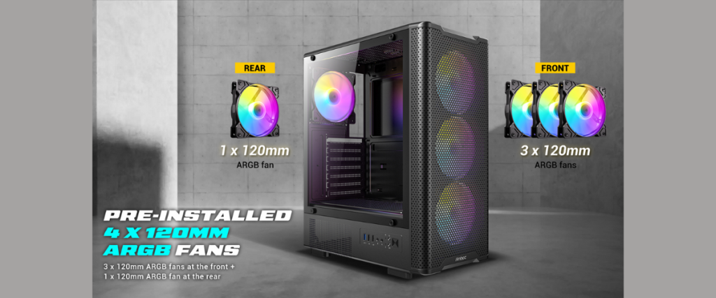 พัดลม ARGB 120 มม. ติดตั้งล่วงหน้า 4 ตัว มาพร้อมพัดลม ARGB 120 มม. ด้านหน้า 3 ตัว และด้านหลัง 1 ตัว เพื่อการระบายความร้อนและแสงไฟที่ลงตัวตั้งแต่แกะกล่อง สามารถติดตั้งพัดลมขนาด 120 มม. ได้พร้อมกันสูงสุดถึง 7 ตัว