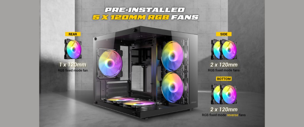 พัดลม ARGB 120 มม. ติดตั้งล่วงหน้า 4 ตัว มาพร้อมพัดลม ARGB 120 มม. ด้านหน้า 3 ตัว และด้านหลัง 1 ตัว เพื่อการระบายความร้อนและแสงไฟที่ลงตัวตั้งแต่แกะกล่อง สามารถติดตั้งพัดลมขนาด 120 มม. ได้พร้อมกันสูงสุดถึง 8 ตัว