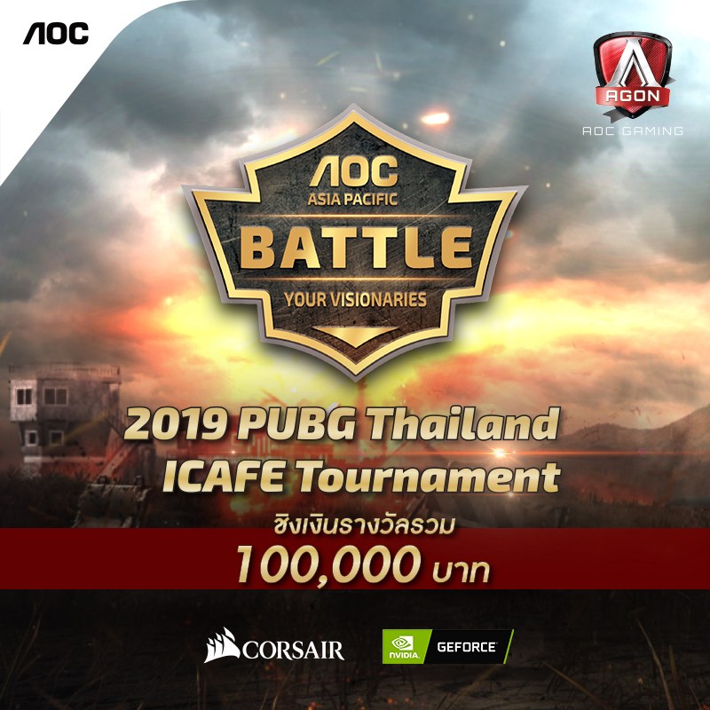 [ กรุงเทพ ประเทศไทย : 10 มิถุนายน 2562 ] AOC ผู้ผลิตจอมอนิเตอร์รายใหญ่ของโลก ร่วมกับ NVIDIA ผู้นำกราฟิกชิประดับโลก และCORSAIR แบรนด์ชั้นนำของวงการเกมมิ่งและอุปกรณ์พีซี ได้ผนึกกำลังร่วมขับเคลื่อนวงการอีสปอร์ตไทยอย่างต่อเนื่อง ด้วยการจัดทัวร์นาเมนต์แข่งขันเกมส์ยอดฮิต PUBG เพื่อปลุกกระแสให้ร้านอินเตอร์เน็ต (ICAFE) กลับมาคึกคักอีกครั้ง โดยการคัดเลือกร้าน ICAFE ทั่วไทยที่ได้มาตราฐาน จำนวน 21 ร้าน เพื่อเป็น Arena สนามแข่งขันในรายการ “2019 PUBG Thailand ICAFE Tournament Presented By AOC” พร้อมชิงเงินรางวัลมูลค่ารวม 100,000 บาท