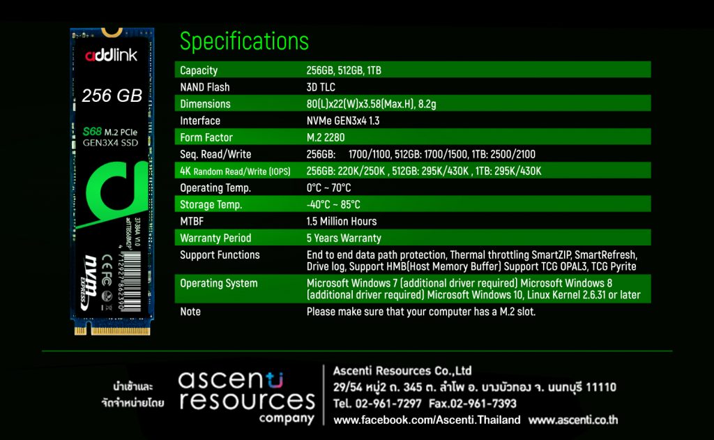 Addlink S68 SSD M.2 NVMe เริ่มวางจำหน่ายที่ขนาดความจุ 256 GB ในราคาเพียง !! 1,250 บาท เท่านั้น สำหรับผู้ที่สนใจสินค้าสามารถหาซื้อได้แล้วตั้งแต่วันนี้ ที่ร้านตัวแทนจำหน่ายสินค้า Ascenti Resources ทั่วประเทศ