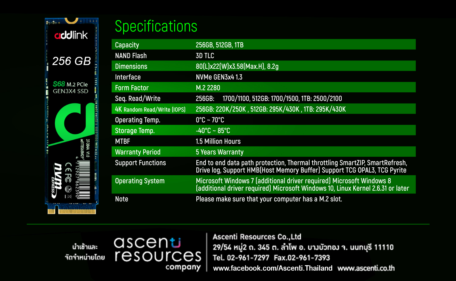 Ascenti Resources เปิดตัว Addlink S68 SSD M.2 NVMe คุ้มค่า ราคาประหยัด พร้อมประกันสุดพรีเมี่ยม 5 Year !!