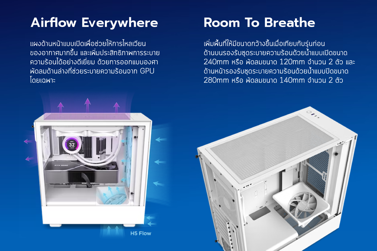 สำหรับโมเดล H5 Flow หนึ่งใน NZXT H5 Series เป็นเคสขนาด Mid-tower ที่ระบายความร้อนได้สมกับชื่อรุ่น เพราะได้มีการออกแบบให้ด้านหน้าเป็นตะแกรงรูเพิ่มประสิทธิภาพการระบายความร้อนได้ดียิ่งขึ้น มาพร้อมกับพัดลม ขนาด 120mm จำนวน 2 ตัว (หลัง 1 ,ล่าง 1)