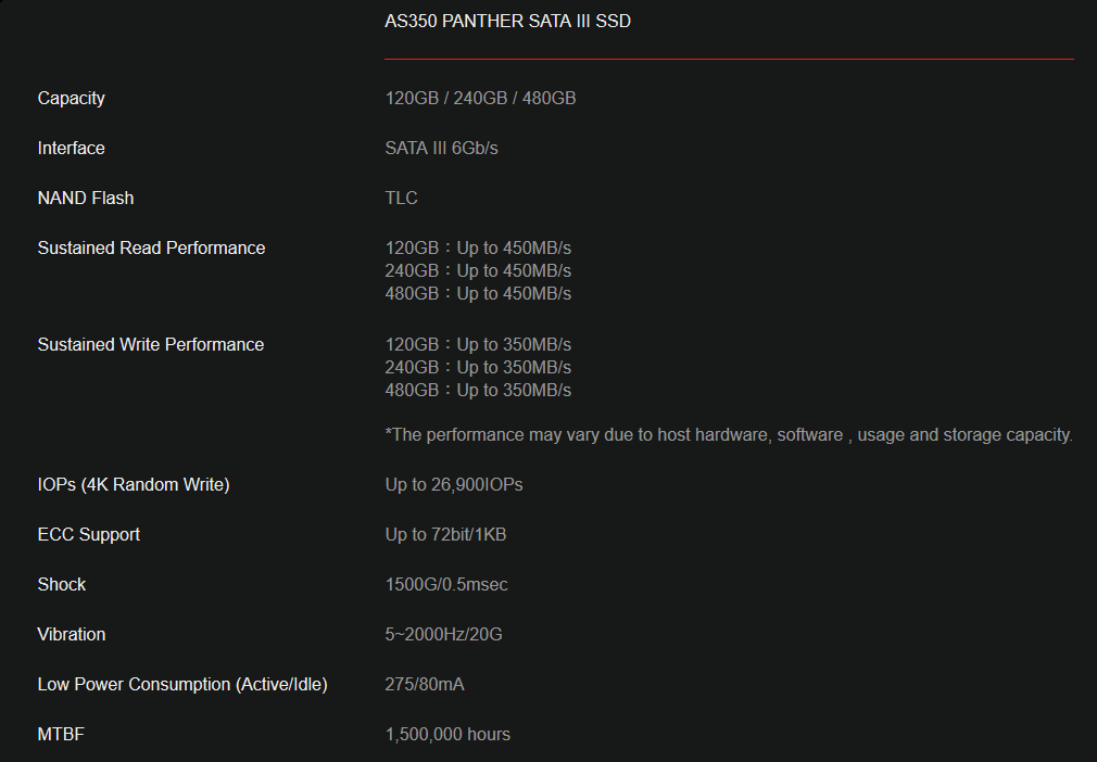 ดังนั้นหากเป็น Series เดียวกับในรุ่น AS350 ก็น่าจะมี Spec ตามนี้เลยครับที่ความเร็ว Seq Read/Write @ 450/350MB/s สำหรับรุ่นขนาดความจุ 120GB ส่วนค่า IOPS (4K Random) อยู่ที่ 26,900 IOPs มีอายุการใช้งาน MTBF ก็จะอยู่ที่ 1,500,000 ชั่วโมงกันเลยทีเดียว ส่วนชนิดเม็ด NAND Flash นั้นระบุมาว่าเป็นแบบ TLC