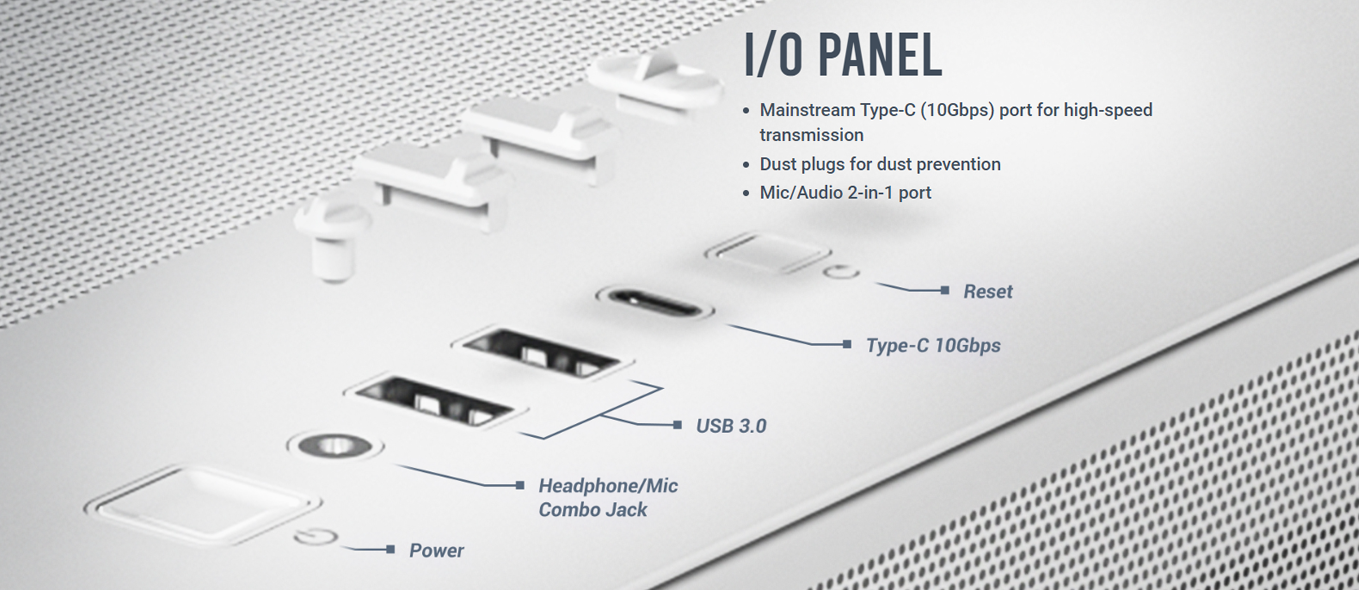 I/O Panel แผงปุ่มด้านบนประกอบด้วย ปุ่ม Power ,Headphone/mic Combo Jack (พอร์ตไมค์/เสียง 2-in-1) ,USB 3.0 x2 และ Type – C (10Gbps) สำหรับการถ่ายโอนความเร็วสูง และ ปุ่ม Reset