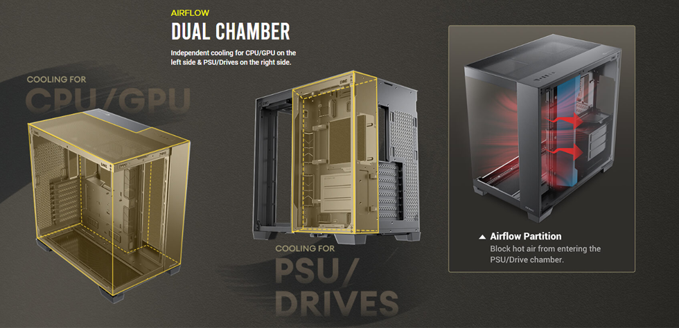 AIRFLOW DUAL CHAMBER สำหรับ ANTEC C8 มีการแบ่งสัดส่วนเคสแบบ DUAL CHAMBER เพื่อให้การจัดสายไฟที่ง่าย และสะดวก รวมถึงส่วนด้านหน้า ออกแบบเพื่อการระบายความร้อนที่มีประสิทธิภาพ โดยดึงเอาอากาศภายนอกเข้าสู่ฮาร์ดแวร์ที่มีความร้อนสูง เช่น CPU และ การ์ดจอ