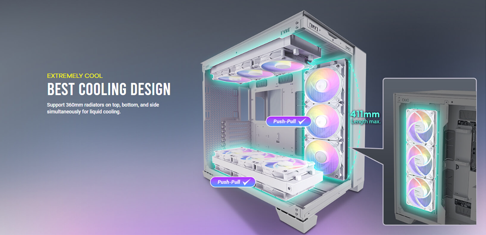 COOLING DESIGN รองรับการติดตั้งชุดระบายความร้อนด้วยน้ำ ด้านบน ด้านล่าง และด้านข้าง ขนาด 120/240/280/360mm เรียกได้ว่ารองรับการติดตั้งได้ถึง 3 จุด ซึ่งน้อยเคสที่จะสามารถติดตั้งชุดน้ำ 3 ตอน ได้แบบครบครัน