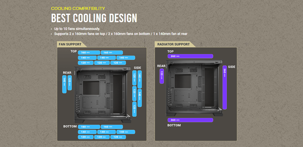 AIRFLOW VERTICAL COOLING ประสิทธิภาพของการระบายความร้อนในแนวตั้ง เพื่อการระบายความร้อน GPU ที่มีประสิทธิภาพ สามารถรองรับพัดลมขนาด 120mm /140mm ได้ 3 ตัว หรือพัดลมขนาด 160mm ได้ 2 ตัว