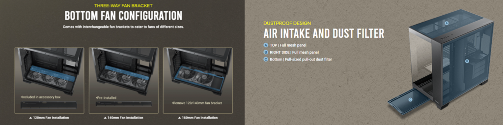 BOTTOM FAN CONFIGURATION & AIR INTAKE AND DUST FILTER มาพร้อมกับ FAN BRACKET รองรับทั้ง 120/140/160mm สะดวก และติดตั้งได้ง่าย สำหรับ DUST FILTER มี 3 ที่ ตำแหน่ง A ,B เป็นแบบเต็มแผ่น และ ตำแหน่ง C ด้านล่างสามารถถอดเข้า – ออกได้