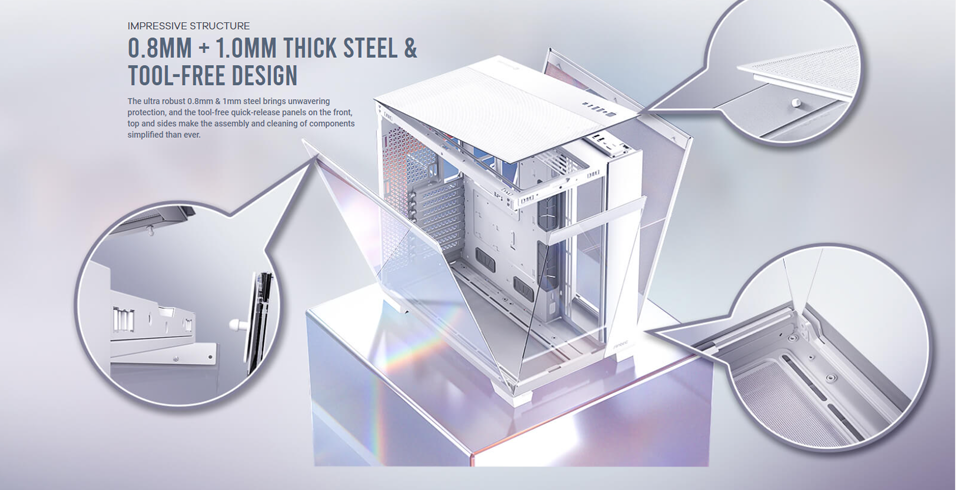 FULL-VIEW PC CASE SEAMLESS EDGE ON FRONT & SIDE PANEL การออกแบบที่ไร้รอยต่อ แบบ Panoramic ระว่างกระจก Tempered Glass ด้านหน้า และด้านข้าง ทำให้ดูกว้างขวาง และโชว์อุปกรณ์ได้อย่างเต็มที่ ตามสไตล์คุณ