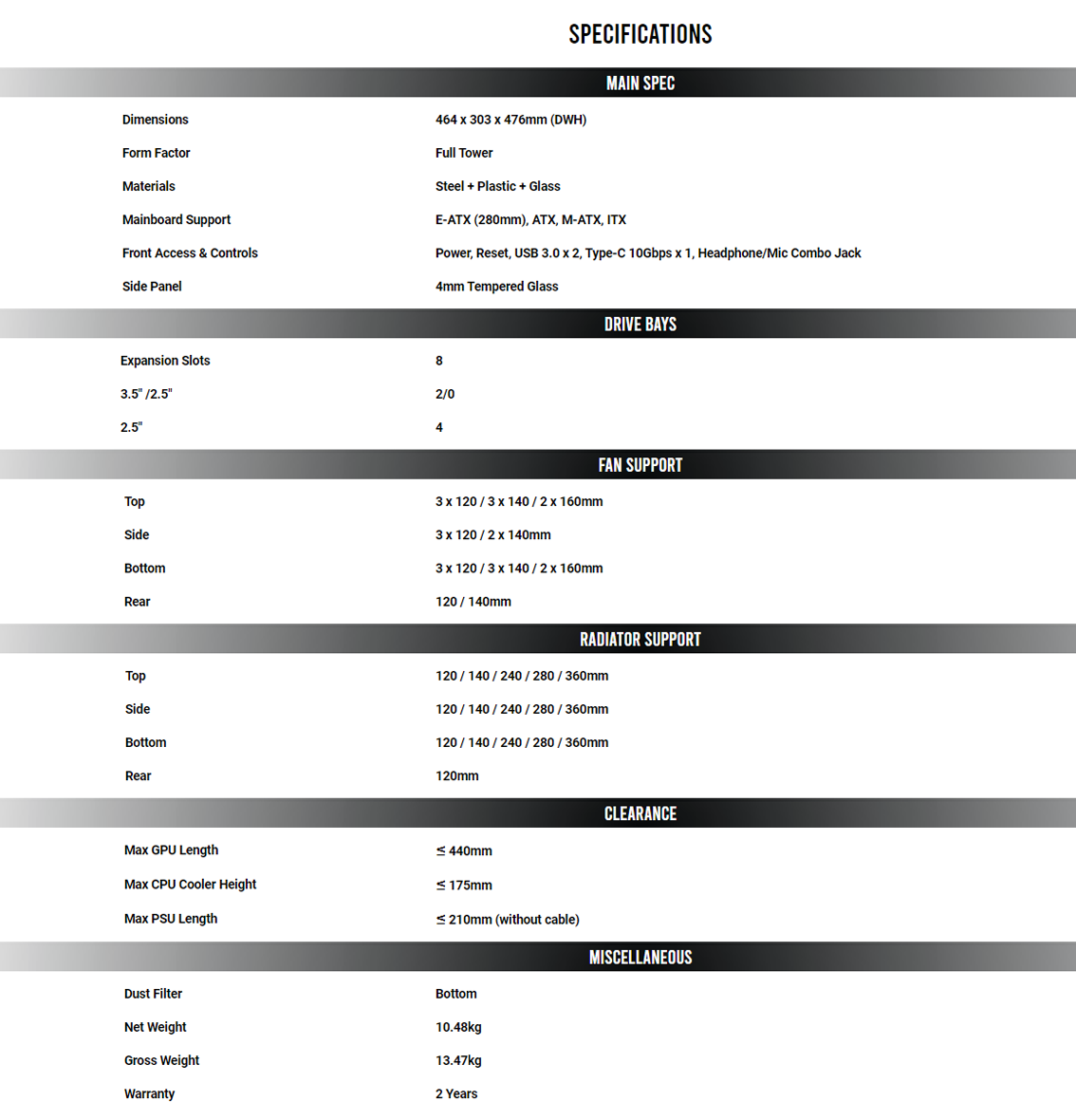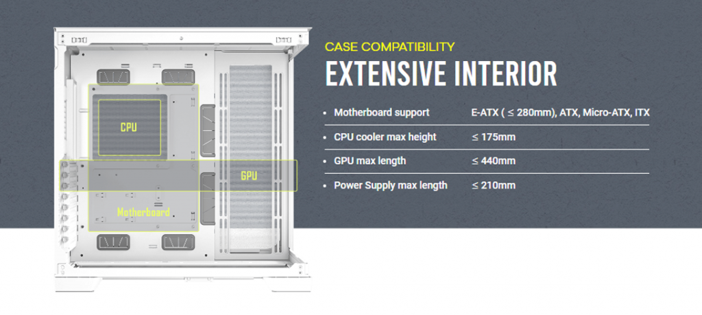 - รองรับการติดตั้งเมนบอร์ดขนาด E-ATX (≤280mm), ATX, Micro-ATX และ ITX