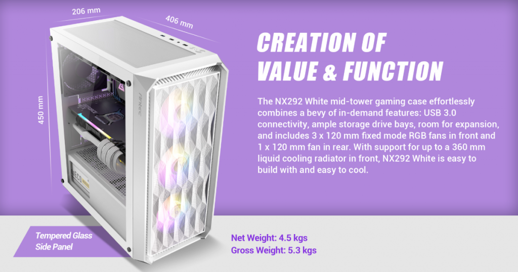 Ascenti พร้อมขายแล้ว เคสสุดคุ้ม รุ่นใหม่ล่าสุด !! Antec NX292 WHITE เคสสุดคุ้มจากตระกูล NX Series สำหรับ Antec NX292 WHITE เป็นเคสเกมมิ่งขนาด Mid-Tower ด้านหน้าเป็นตาข่าย Mesh ลายคลื่น ที่ทำให้อากาศไหลเวียนได้ดีเยี่ยม ติดตั้งพัดลมขนาด 120mm. RGB Fixed Mode บริเวณด้านหน้า 3 ตัว และ พัดลม ขนาด 120mm. 1 ตัว (สามารถติดตั้งพัดลมได้สูงสุด 8 ตัว) รองรับชุดระบายความร้อนด้วยน้ำ ขนาด 120/140/240/280/360mm. บริเวณด้านหน้า และ ด้านข้างเป็นฝากระจก Tempered Glass สามารถโชว์อุปกรณ์ภายในได้อย่างสวยงาม สร้างขึ้นมาเพื่อเกมเมอร์มีความคุ้มค่า และมีฟังก์ชั่นการใช้งานที่ครบครัน