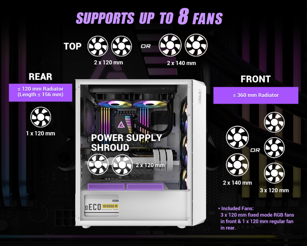 รองรับการติดตั้งพัดลมระบายความร้อนขนาด 120มม. มากสุดถึง 8 ตัว