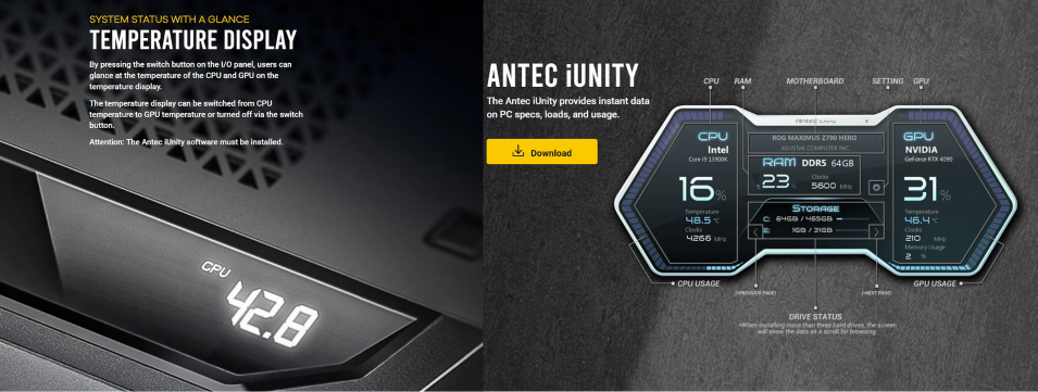 TEMPERATURE DISPLAY มุมด้านบนขวามือของตัวเคส มีจอแสดงผลอุณหภูมิโดยกดปุ่มสวิตช์บนแผง I/O เพื่อเช็คอุณหภูมิของ CPU และ GPU สลับกันได้ อีกทั้งผู้ใช้สามารถดูค่าการทำงานของ CPU และ GPU ได้โดยดาวน์โหลดซอฟแวร์ ANTEC iUNITY สามารถเช็คสเปคคอมพิวเตอร์ และดูค่าการทำงานต่าง ๆ ของเครื่องได้ *หมายเหตุ ผู้ใช้ต้องดาวน์โหลดซอฟแวร์ ANTEC iUNITY เพื่อใช้งาน Temperature Display