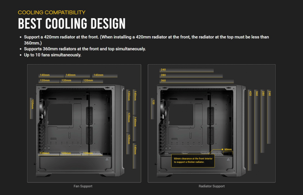 - รองรับหม้อน้ำด้านบนขนาด 120/140/240/280/360mm และด้านหน้า ขนาด 120/140/240/280/360/420mm