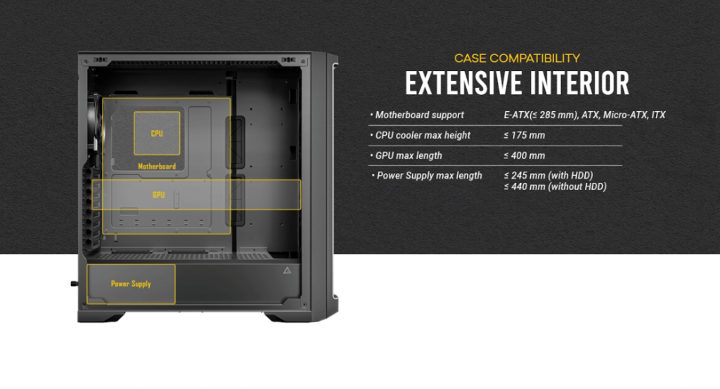 - รองรับการติดตั้ง Power Supply ได้ยาวสุด 245mm ในกรณีมี Drive Bay / 440mm ในกรณีไม่มี Drive Bay