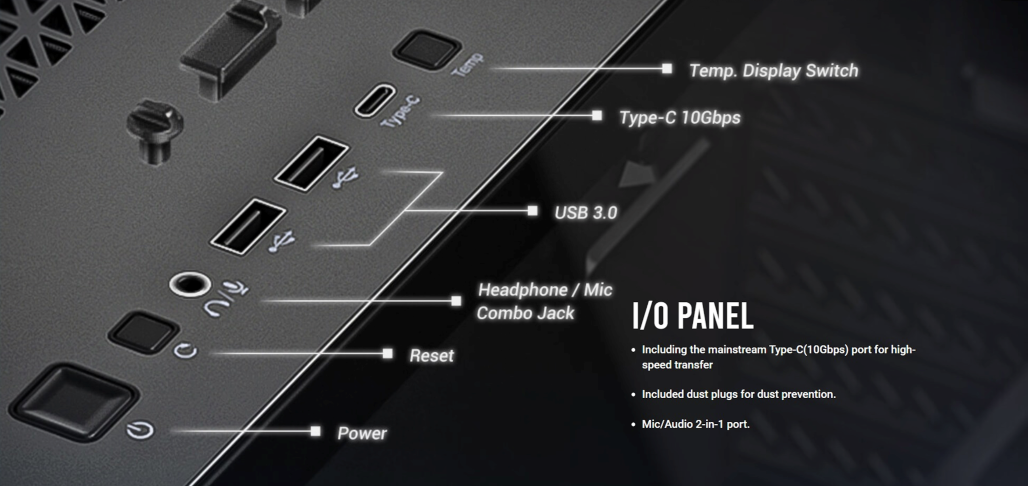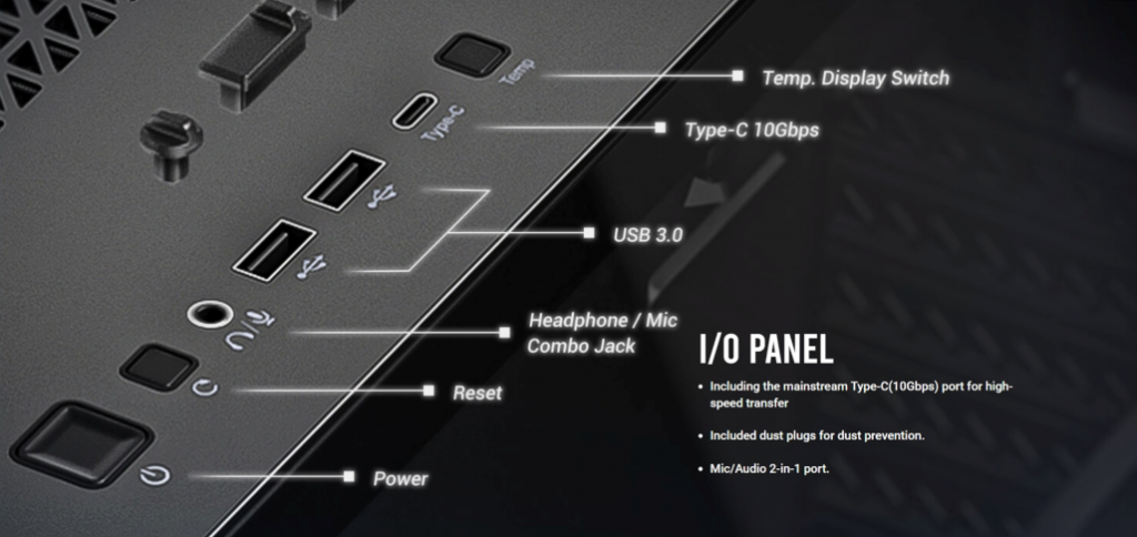 I/O PANEL แผงปุ่มด้านบนประกอบด้วย ปุ่ม Power ,Reset ,Headphone/mic Combo Jack (พอร์ตไมค์/เสียง 2-in-1) ,USB 3.0 x2 และ Type – C (10Gbps) สำหรับการถ่ายโอนความเร็วสูง และ Temp. Display Switch ปุ่มกดปรับ CPU/ GPU