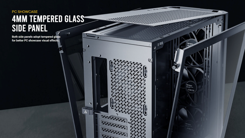 4MM TEMPERED GLASS SIDE PANEL แผงด้านข้างทั้งสองฝั่งเป็นกระจก Tempered Glass ขนาด 4mm เพื่อให้สามารถแสดงเอฟเฟ็กต์ต่างๆ และโชว์อุปกรณ์ได้อย่างเต็มที่