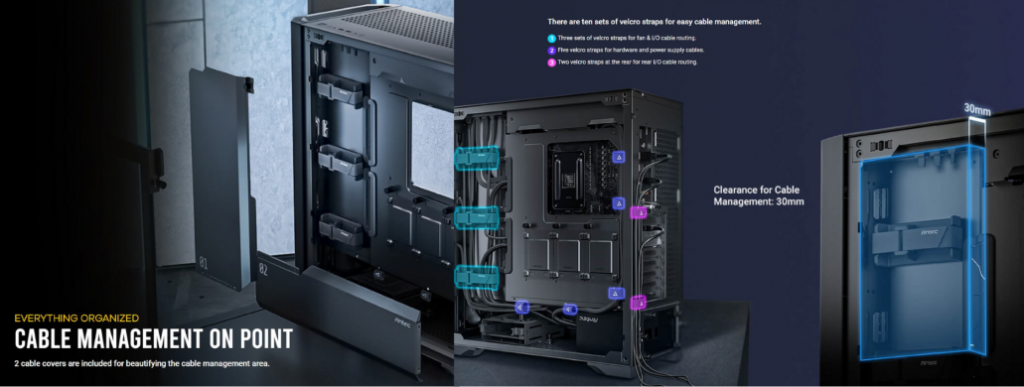 CABLE MANAGEMENT ON POINT ด้านหลังเคสมีการออกแบบแบ่งสัดส่วน การจัดการสายได้อย่างลงตัว โดยมีแผ่นครอบโลหะ 2 ชิ้นสำหรับ ปิดบังซ่อนสายไฟ ให้สวยงามยิ่งขึ้น และมีสายรัดตีนตุ๊กแก 10 ชุดเพื่อการจัดการสายที่ง่ายดาย