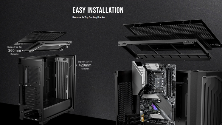 EASY INSTALLATION Cooling Bracket ที่ด้านบน สะดวก ถอดออกง่าย และติดตั้งได้ง่าย รองรับหม้อน้ำด้านบนขนาด 120/240 280/360mm และด้านหน้า ขนาด 120/240/280/420mm