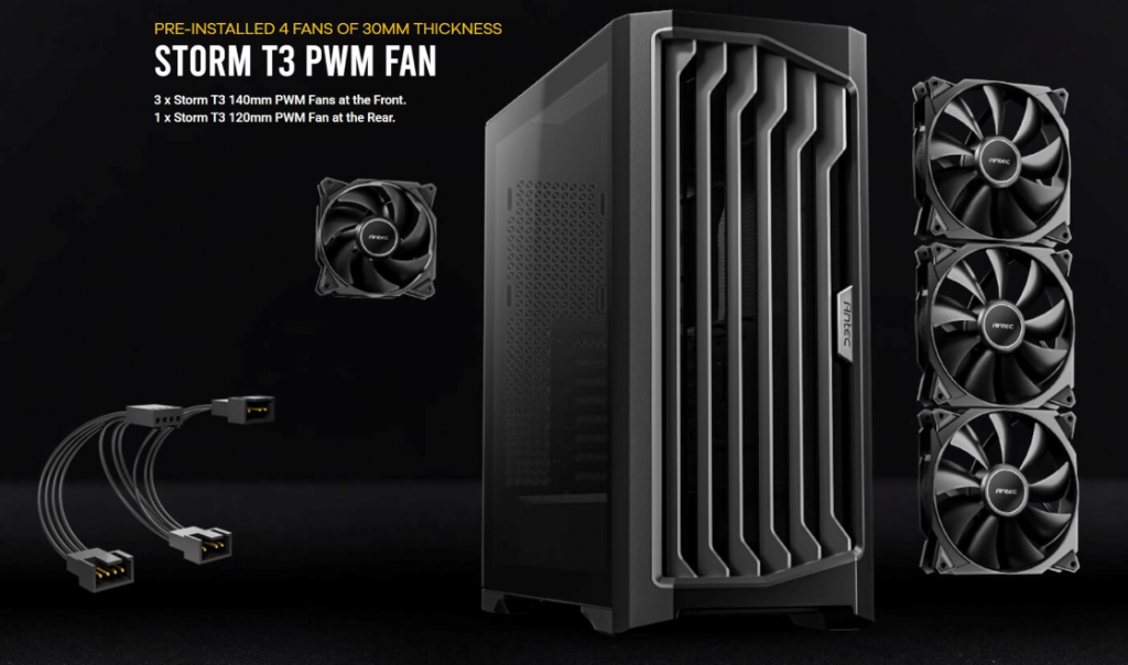 STORM T3 PWM FAN Antec Performance 1 FT ติดตั้งพัดลม STORM T3 PWM มาให้ทั้งหมด 4 ตัว (ด้านหน้า 3 ตัว ขนาด 140mm และด้านหลัง 1 ตัวขนาด 120mm) และสามารถรองับการติดตั้งพัดลมได้สูงสุดถึง 10 ตัว