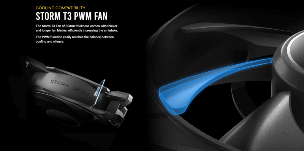 STORM T3 พัดลมรุ่นใหม่ล่าสุดที่ส่งมอบพลัง Supreme Airflow ด้วยการออกแบบเพิ่มความหนาของเฟรมเป็น 30mm ใบพัดลมเพิ่มความหนา 25% และ Air-Concentrating Design กรอบเคส และเส้นโค้งที่ออกแบบมาอย่างดีทำให้การไหลเวียนของอากาศแรงขึ้น ลดการไหลปั่นป่วนและเสียงรบกวนจากพัดลม และเพิ่มประสิทธิภาพส่งผลให้เกิด Airflow ที่เเข็งเเกร่ง ลดกระเเสลมที่ปั่นป่วน และเสียงรบกวน พัดลมใช้ลูกปืนคุณภาพสูงอย่าง Fluid Dynamic Bearing มุมพัดลมจุดยึดน็อตมียางกันสั่นสะเทือน และมาพร้อมกับคุณสมบัติ PWM ซึ่งช่วยให้คุณสามารถควบคุมความเร็วของพัดลมได้อย่างแม่นยำแบบอัตโนมัติ