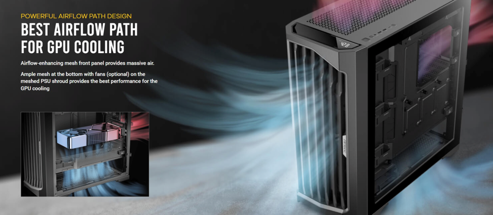 BEST AIRFLOW PATH FOR GPU COOLING การออกแบบเส้นทางการไหลของอากาศที่ทรงพลัง โดยแผงตาข่ายด้านหน้าสำหรับการไหลเวียนของอาการให้เข้าได้อย่างเต็มที่ และแผงตาข่ายขนาดใหญ่ที่ด้านล่างหากติดตั้งพัดลมเพิ่มบนแผง PSU จะช่วยให้ประสิทธิภาพที่ดีที่สุดสำหรับการระบายความร้อนของ GPU