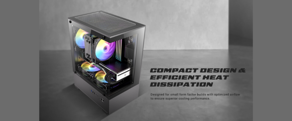 VCX100M ARGB โดดเด่นด้วยดีไซน์กะทัดรัดที่ระบายความร้อนได้อย่างเหนือชั้นเพื่อคอมพิวเตอร์ขนาดเล็ก พร้อมมอบมุมมอง Panoramic View 270 องศา แบบไร้รอยต่อผ่านกระจก Tempered Glass คุณภาพสูงทั้งด้านหน้าและด้านข้าง ช่วยให้คุณโชว์ความสวยงามของอุปกรณ์ภายในได้อย่างชัดเจนทุกองศาดุจตู้โชว์ระดับพรีเมียม