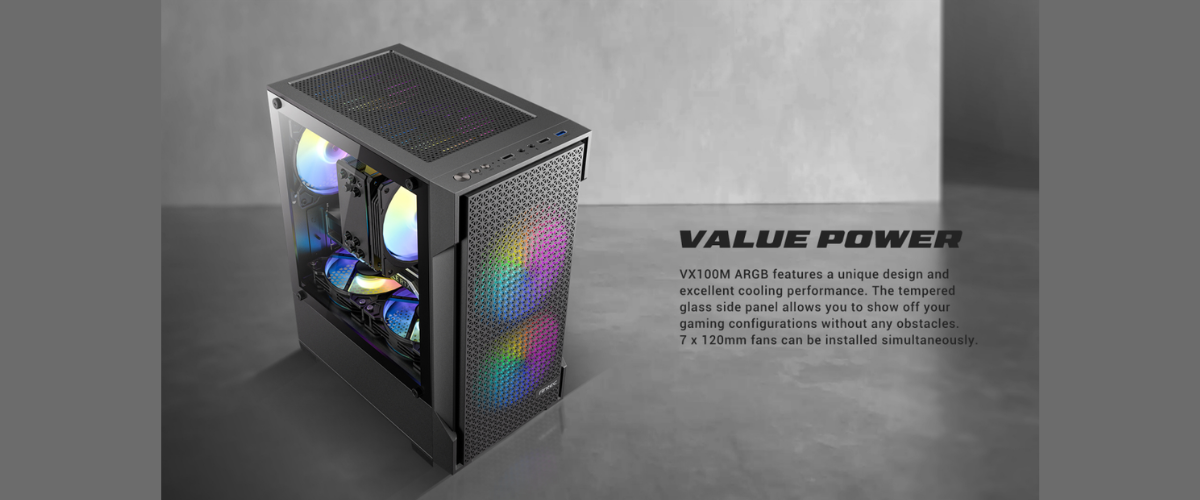 VX100M ARGB ชูจุดเด่นเรื่องความคุ้มค่าด้วยดีไซน์อันเป็นเอกลักษณ์และการระบายความร้อนที่ยอดเยี่ยม มาพร้อมฝาข้างกระจก Tempered Glass ที่ช่วยโชว์อุปกรณ์ภายในได้อย่างชัดเจน และรองรับการติดตั้งพัดลมขนาด 120 มม. ได้สูงสุดถึง 7 ตัวพร้อมกัน เพื่อประสิทธิภาพการจัดการความร้อนในระดับสูงสุด