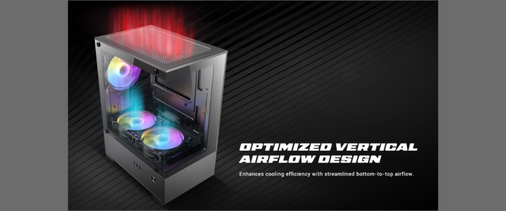 VCX100M ARGB การระบายความร้อนด้วยทิศทางลมแนวตั้งที่ออกแบบมาอย่างเหมาะสม ช่วยให้การไหลเวียนของอากาศจากล่างขึ้นบนเป็นไปอย่างราบรื่นและรวดเร็ว มอบการกระจายความร้อนที่ยอดเยี่ยมและคงความเสถียรให้กับระบบในระดับสูงสุด