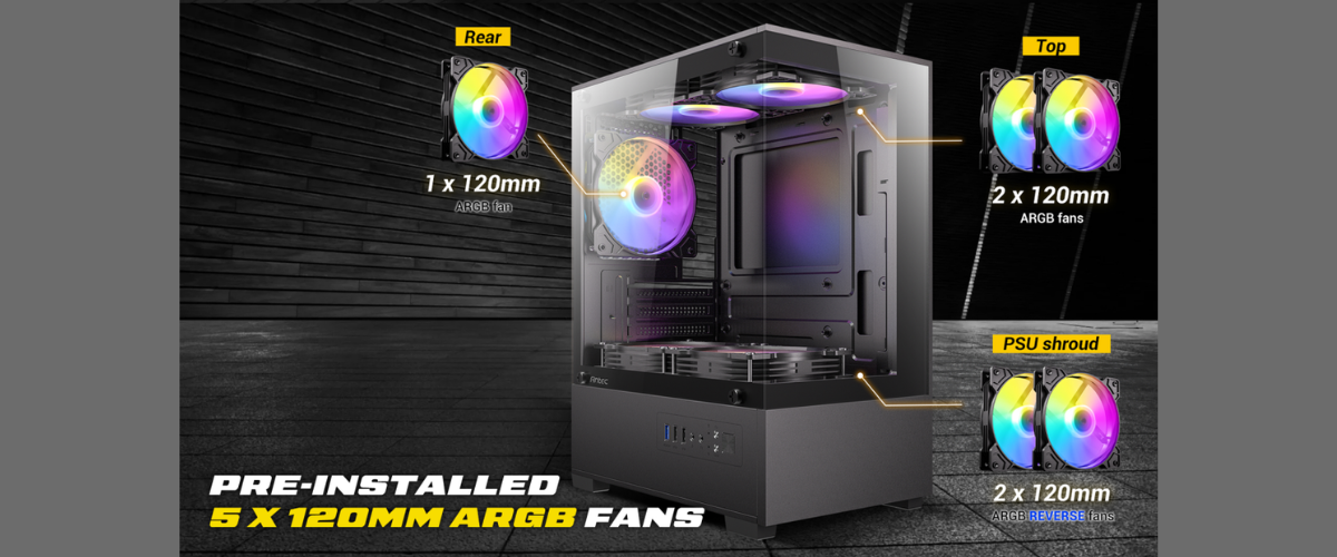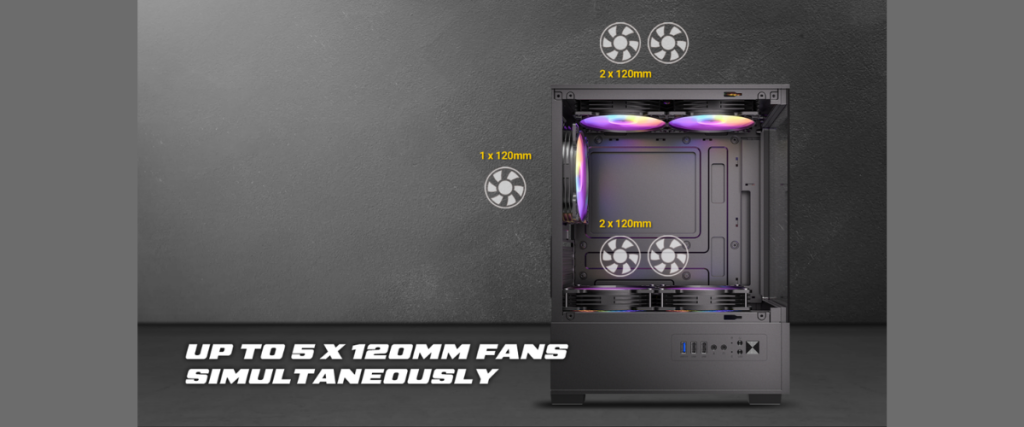 VCX100M ARGB ติดตั้งพัดลม ARGB 120 mm ติดตั้งมาแล้วจากโรงงานทั้งหมด 5 ตัว โดยติดตั้งด้านบน 2 ตัว ด้านล่าง 2 ตัว และด้านหลัง 1 ตัว