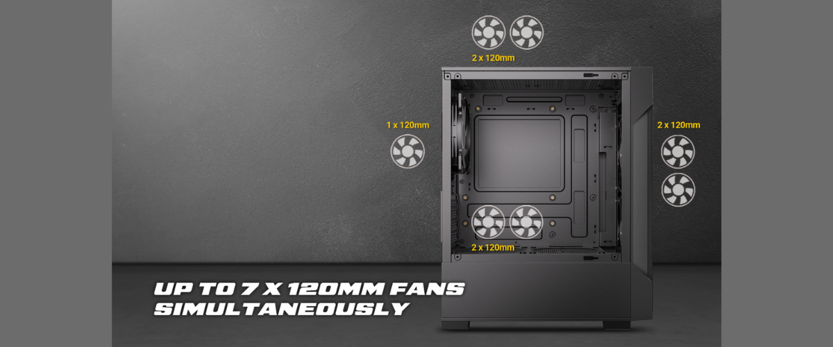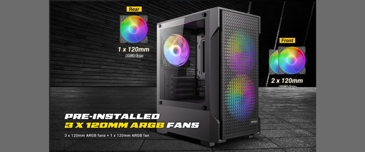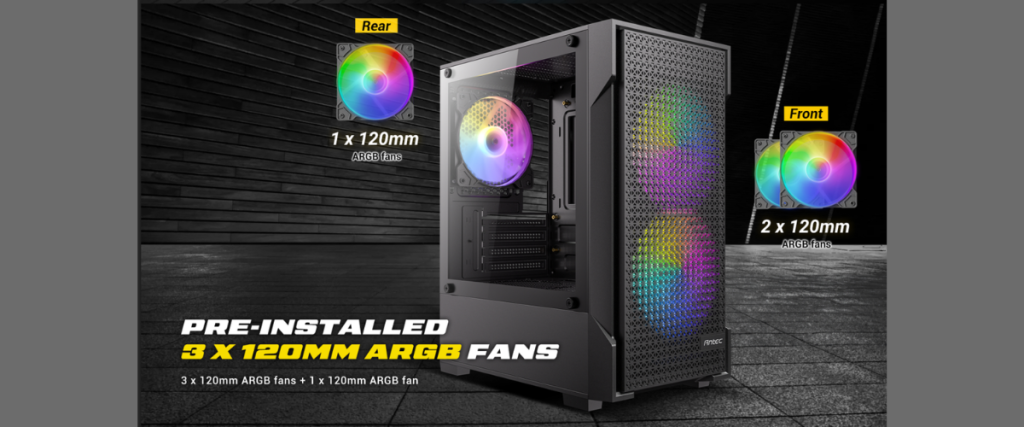 VX100M ARGB ติดตั้งพัดลม ARGB 120 mm ติดตั้งมาแล้วจากโรงงานทั้งหมด 3 ตัว โดยติดตั้งด้านหน้า 2 ตัว และด้านหลัง 1 ตัวยกระดับการระบายความร้อนด้วยแผงหน้ากากดีไซน์ High-Airflow ที่เปิดรับอากาศเข้าสู่ระบบได้อย่างเต็มพิกัดจากช่องทางเดินอากาศรอบทิศทาง ช่วยให้การถ่ายเทและกระจายความร้อนภายในทำได้อย่างรวดเร็วและมีประสิทธิภาพสูงสุด