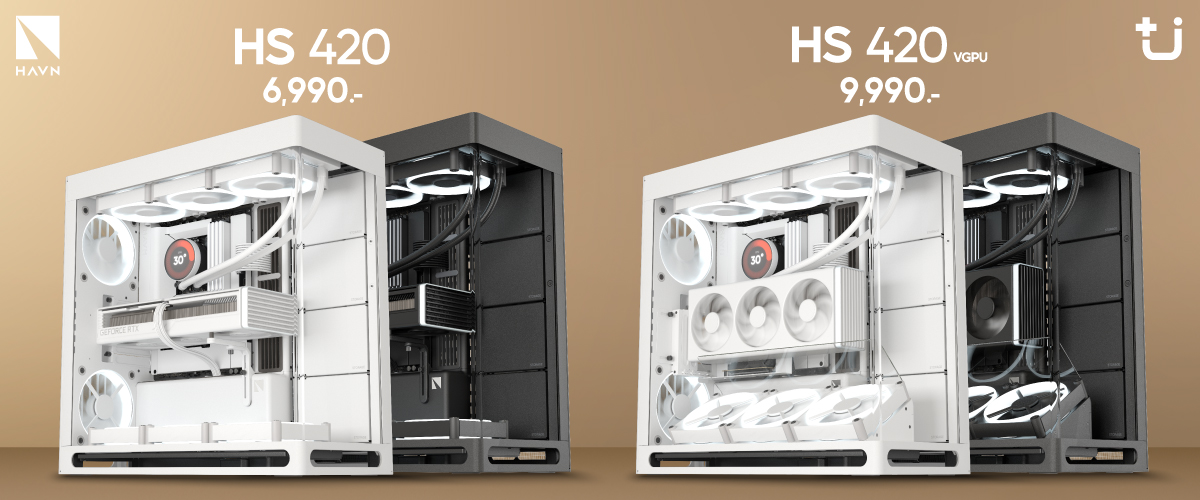 HAVN Hybrid Structure for Optimal GPU Cooling : HS 420 และ HS 420 VGPU เคสทรง Mid-Tower มาพร้อมกับการออกแบบ Dual-Chamber ที่ช่วยให้การไหลเวียนอากาศได้อย่างสมดุล สามารถดึงอากาศเย็นจากด้านล่างขึ้นไปยังการ์ดจอที่ติดตั้งอยู่กลางเคส ผลักความร้อนออกตามทิศทาง Airflow ได้อย่างมีประสิทธิภาพ ช่วยให้การ์ดจอได้รับการระบายความร้อนอย่างดีที่สุด