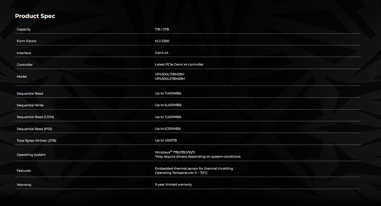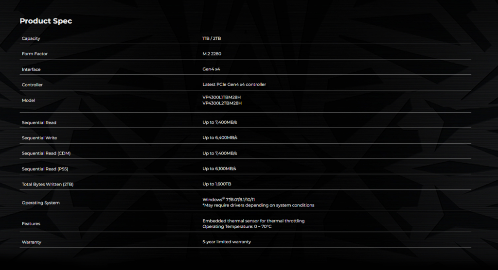 Game-changing Speeds, Unmatched Performance, Unmatched Speed : PATRIOT VP4300 Lite ความเร็วที่เปลี่ยนแปลงเกม และประสิทธิภาพที่ไม่มีใครเทียบมอบความเร็วปานสายฟ้า เพื่อประสบการณ์การเล่นเกมที่ไม่มีใครเทียบได้ ด้วยความเร็วในการอ่านสูงถึง 7,400MB/s และความเร็วในการเขียนต่อเนื่องสูงถึง 6,400MB/s