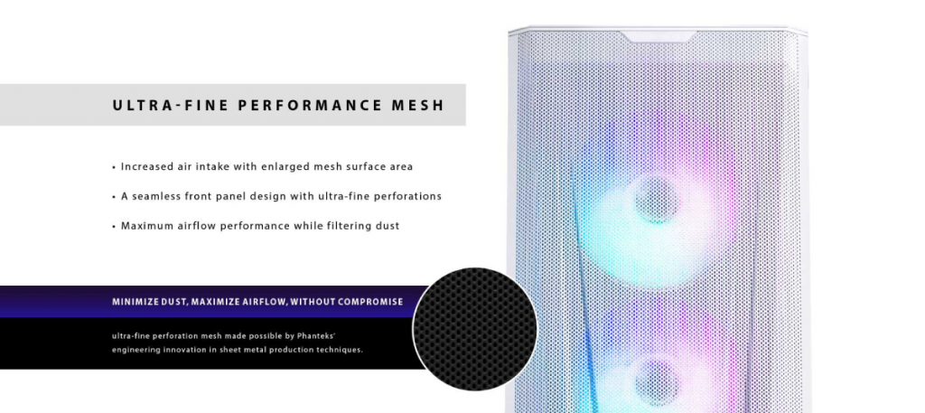 ULTRA – FINE PERFOMANCE MESH แผงด้านหน้าโลหะมีการออกแบบ Ultra-fine Performance Mesh ของ Phanteks ที่รวมประสิทธิภาพการไหลเวียนของอากาศสูงเข้ากับการกรองฝุ่นแบบ all-in-one
