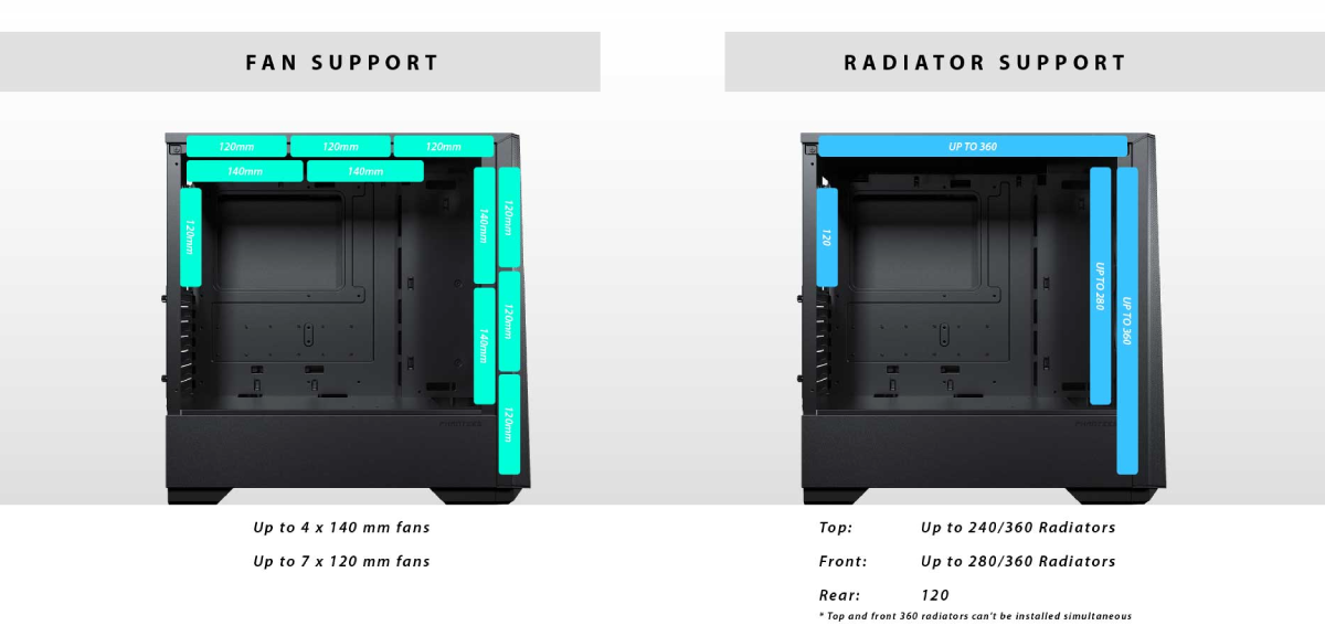 FAN & RADIATOR SUPPORT สามารถรองรับการติดตั้งพัดลมขนาด 140mm ได้ 4 ตัว และพัดลมขนาด 120mm ได้สูงสุด 7 ตัว รองรับการติดตั้งชุดระบายความร้อนด้วยน้ำ ด้านบนขนาด 240/360mm ด้านหน้า ขนาด 280/360mm และด้านหลัง 120mm
