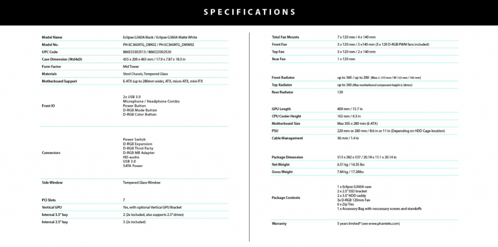 สำหรับเคส PHANTEKS ECLIPSE G360A มีให้เลือกทั้งหมด 2 สี คือสีดำ และสีขาว
