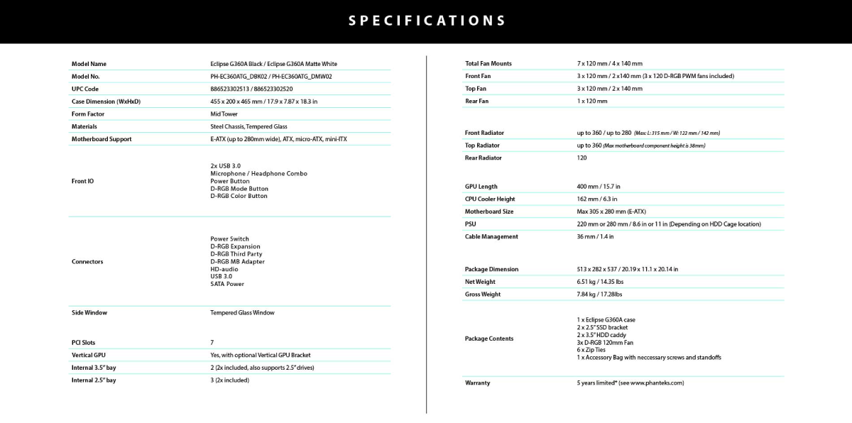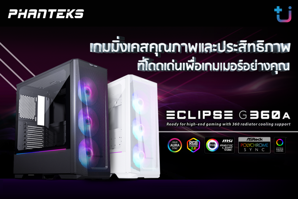 PHANTEKS IS BACK พร้อมเปิดตัวเคสรุ่นใหม่ล่าสุด PHANTEKS ECLIPSE G360A เป็นหนึ่งใน ECLIPSE Series ซึ่งเป็นที่รู้จักในด้านความคุ้มค่า เป็นเคสขนาด Mid-Tower ออกแบบมาสำหรับเกมเมอร์ที่ต้องการเล่นเกมในระดับไฮเอนต์ ด้านหน้าได้รับการออกแบบมาเพื่อให้ตอบสนองการระบายความร้อนอย่างมีประสิทธิภาพ โดยด้านหน้ามีดีไซน์แบบ Ultra-fine Performance Mesh ติดตั้งพัดลม D-RGB 3 ตัว ขนาด 120mm และรองรับการติดตั้งชุดระบายความร้อนด้วยน้ำ ขนาด 360mm ด้านข้างเป็นกระจก Tempered glass ขอบด้านล่างกระจกตกแต่งด้วยไฟ LED STRIP เพื่อเพิ่มความโดดเด่นให้ตัวเคส ซึ่งคงความเป็นเอกลักษณ์ของทาง PHANTEKS