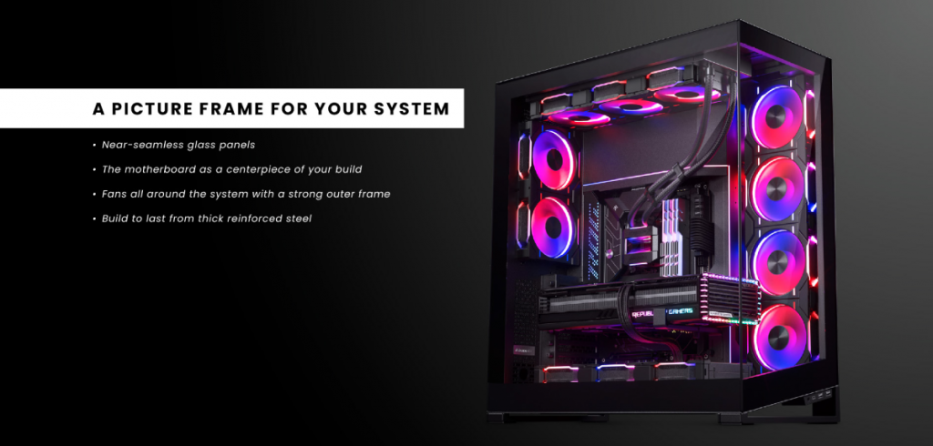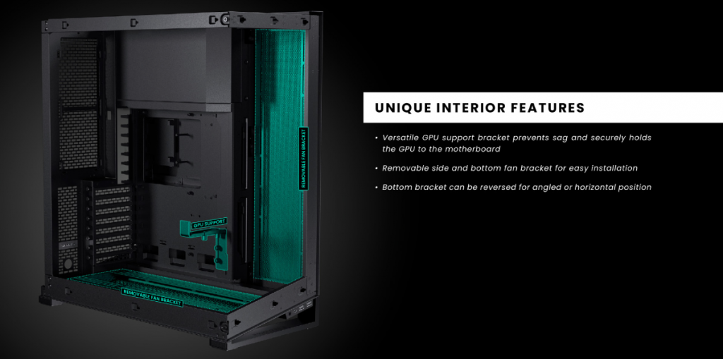 A PICTURE FRAME FOR YOUR SYSTEM สำหรับด้านหน้า และด้านข้างเคสเป็นแผงกระจกใส (Tempered Glass) แบบเกือบไร้รอยต่อให้มุมมองที่สมบูรณ์แบบโชว์อุปกรณ์ภายในได้อย่างอิสระมองจากภายนอกเป็นเคสที่ดูสวยงาม สะอาดตา และเรียบหรู โดยมีการออกแบบให้สามารถติดตั้งพัดลมได้ทั่วเมนบอร์ด ซึ่งเป็นหัวใจของระบบของคุณ เหมือนกับกรอบรูป