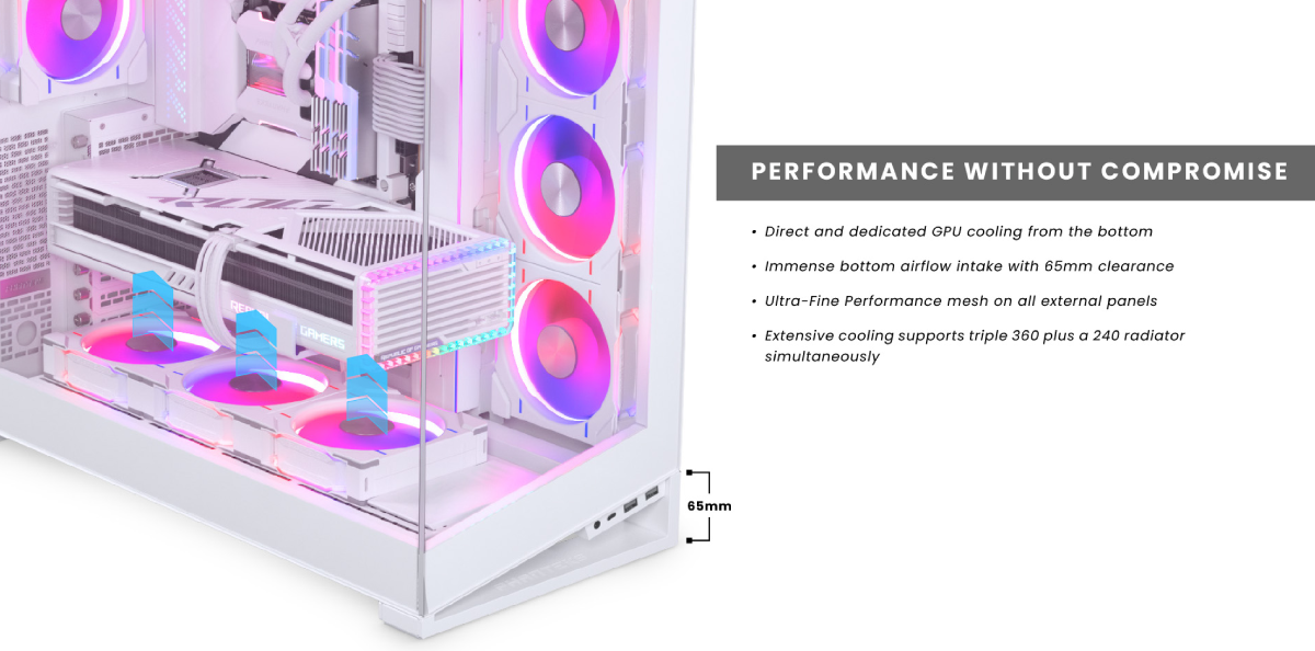 PERFORMANCE WITHOUT COMPROMISE ฐานรองเคสมีอการออกแบบให้เป็นแนวเฉียงสูงขึ้นจากฐาน 65mm พร้อมช่องด้านล่างขนาดใหญ่ที่ให้ประสิทธิภาพการระบายความร้อนที่ดีที่สุดแก่ GPU ด้านหน้าเคสมาพร้อมกับพอร์ตเชื่อมต่อ Jack 3.5 ,USB-C และ USB-A