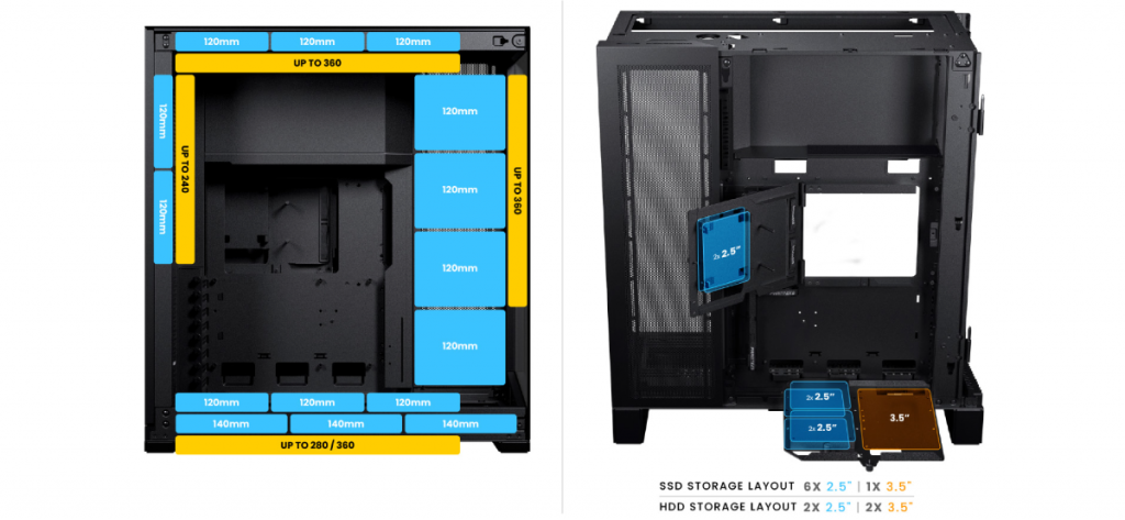 FAN & RADIATOR SUPPORT / STORAGE OPTIONS สามารถรองรับการติดตั้งพัดลมขนาด 120mm ได้สูงสุดถึง 12 ตัว และรองรับการติดตั้งชุดระบายความร้อนด้วยน้ำ ด้านหน้า ขนาด 120/240/360mm ด้านบนขนาด 120/360mm และด้านหลัง 120/240mm รองรับการ์ดจอได้ขนาดสูงสุด 450mm และรองรับการติดตั้ง Power Supply ขนาด 255mm รองรับการติดตั้ง SSD ขนาด 2.5” x 6 หรือ 3.5” x1 และ HDD ขนาด 2.5” x 2 หรือ 3.5” x 2